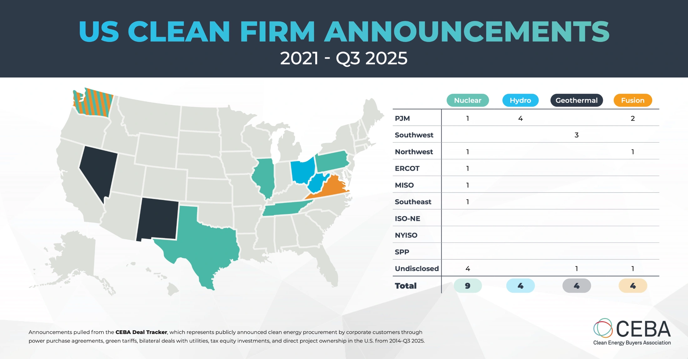 CEBA has tracked 21 clean firm deals in the U.S., involving nuclear, fusion, geothermal, and hydro projects. These deals, which are limited to new or qualified repowering projects, show that: